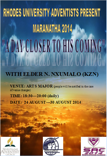 Maranatha 2014, was conducted by Elder Nda Nxumalo from the Margate Central SDA church in the KZN. The theme followed this year is "A day closer to His coming"